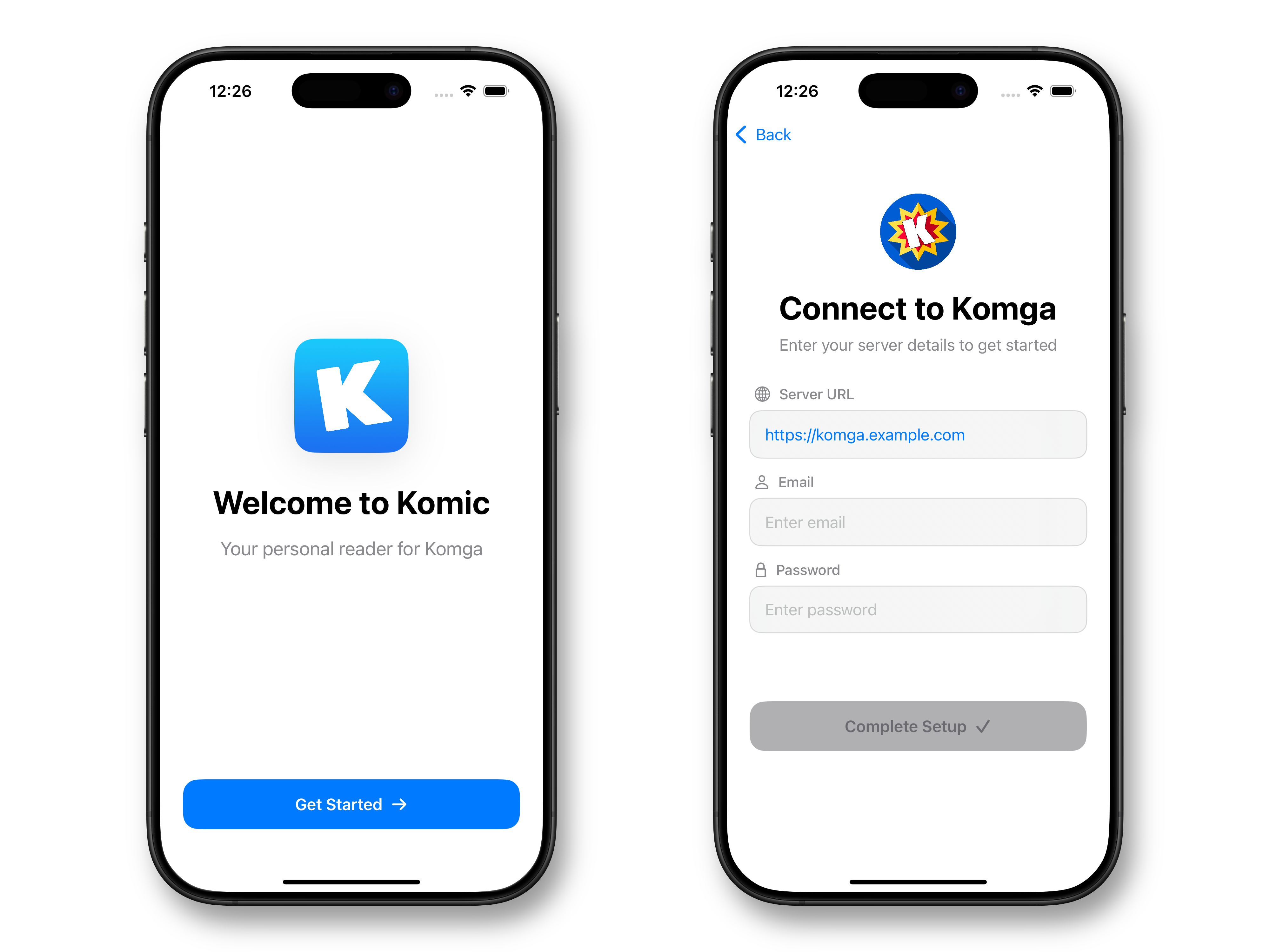 The first time you open Komic, you will be prompted to add a server. Enter your server address, username, and password.