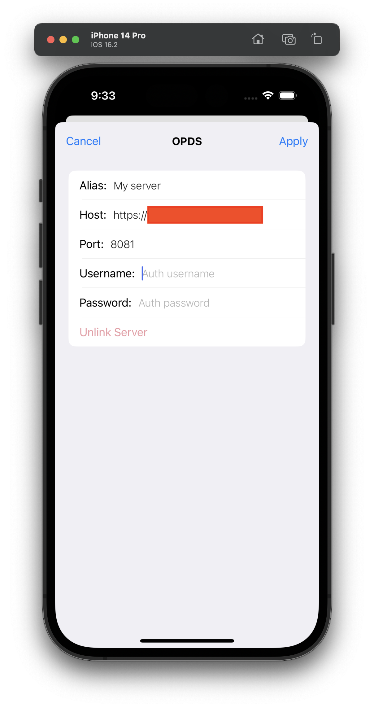 You'll be taken to the OPDS configuration screen. Give any name to your server, then enter your server address, username, and password. Tap on Apply.