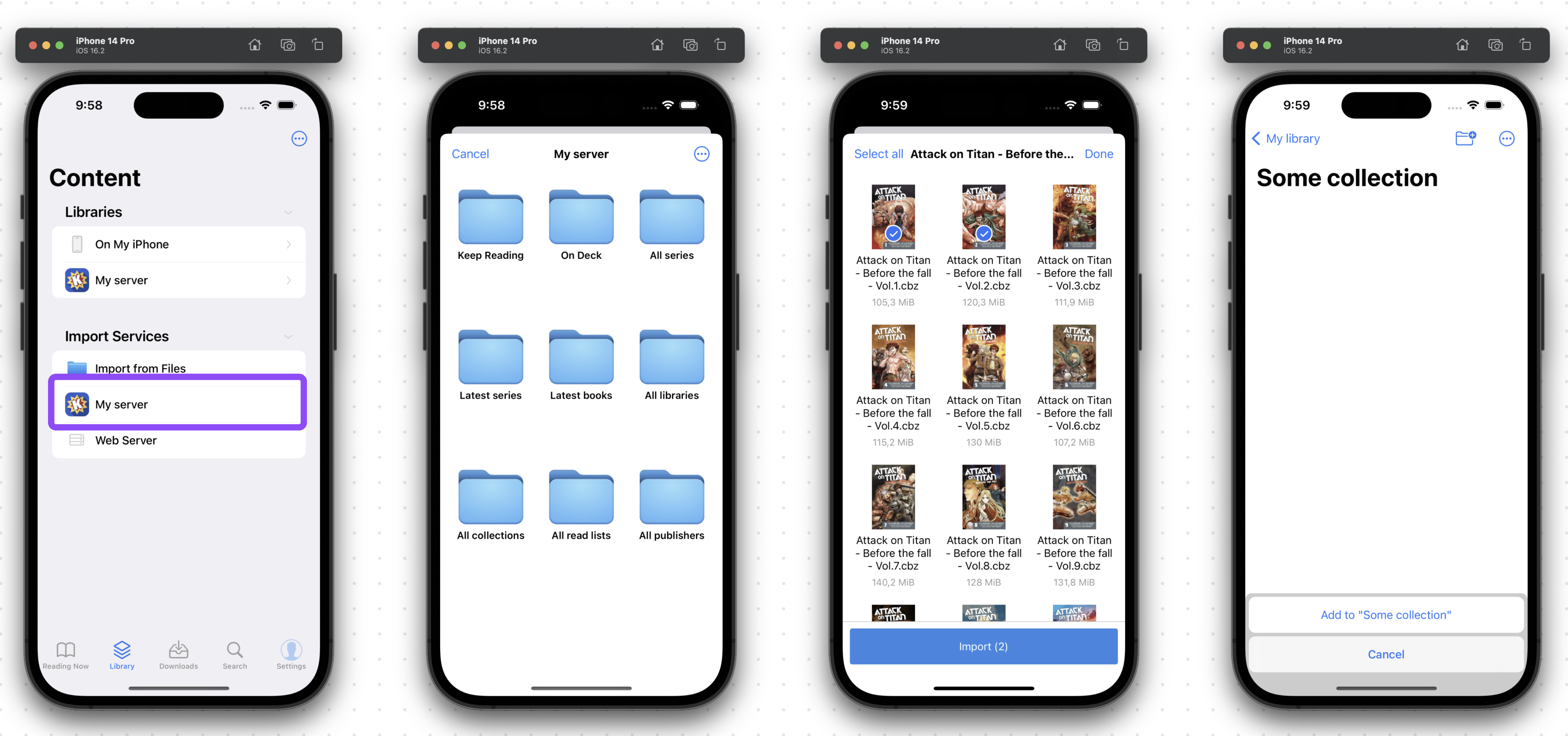 Panels treats OPDS feeds as libraries. That means you can navigate your server library as if it was on your own device, with the benefit of keeping all files stored somewhere else. Once you find a title you want to read, you can tap to open and start reading it (stream) or you can choose to download it for offline use. Long press a title (or select many) to show all options.