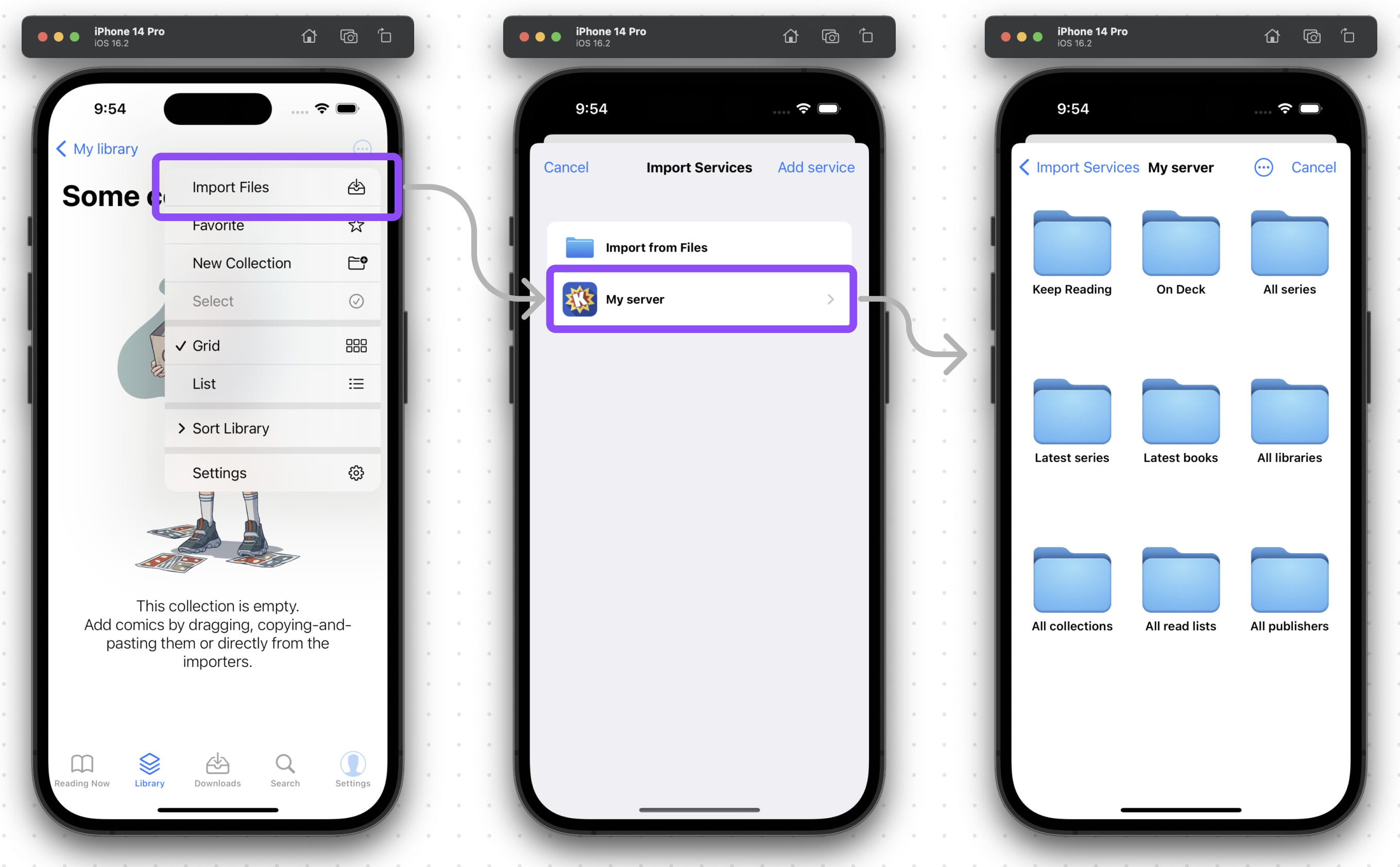 Panels app allows you to connect with any OPDS compatible server. With Panels you will be able to to remotely download or stream your comics using your iPhone or iPad. With Panels, users can conveniently navigate through their entire Komga library and keep track of their reading progress.
