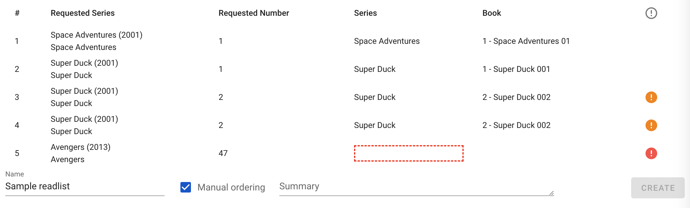 If some books are not matched, you can manually choose a series and a book. Duplicates and missing books will be shown with an error indicator on the right side.